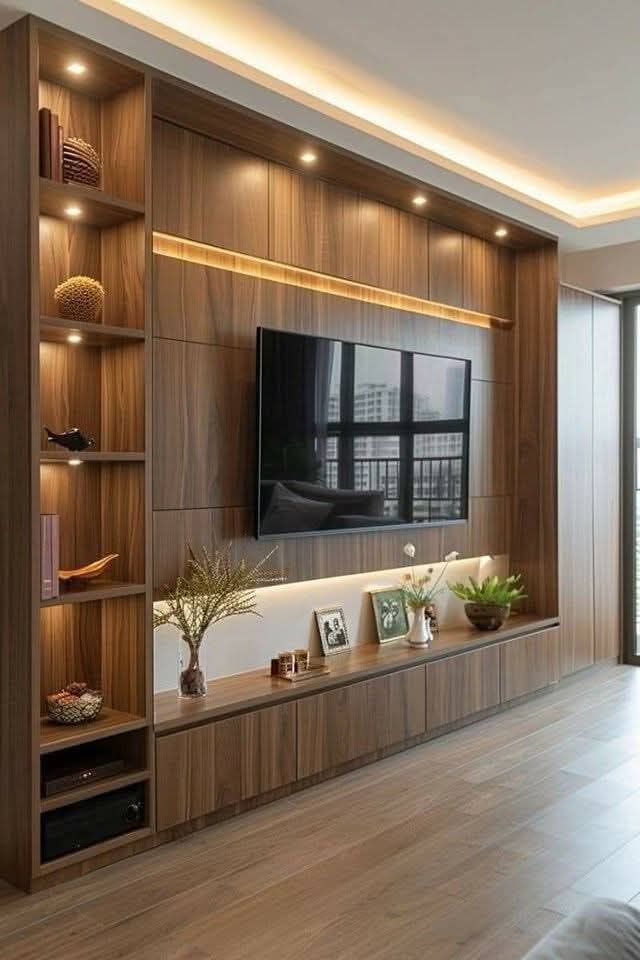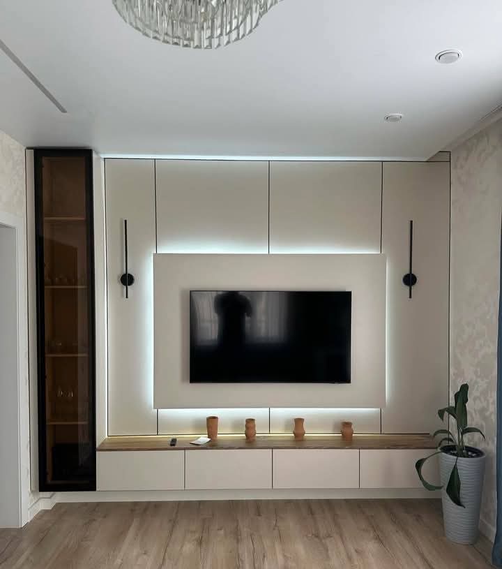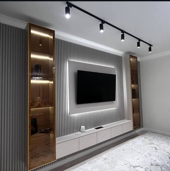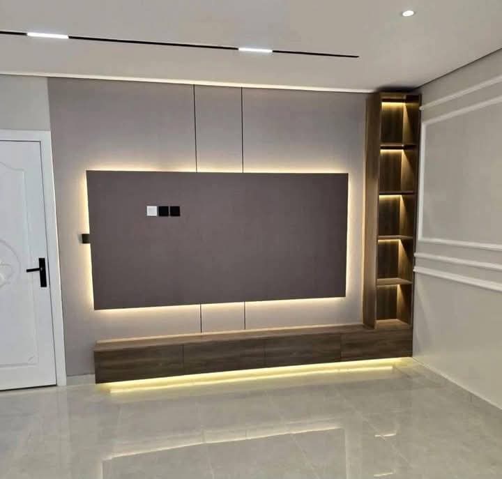 تصميم يمتد على كامل الحائط ويحتوي على فتحات جانبية مزودة بإضاءة داخلية، تستخدم لعرض الإكسسوارات أو تخزين أجهزة التحكم وأنظمة الصوت.