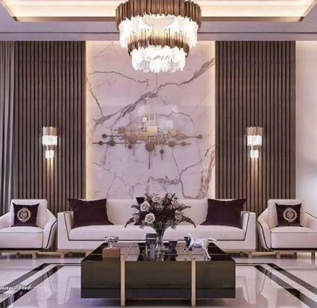 1. ​خلفيات التلفاز: دمج ألواح بديل الخشب الطولية مع بديل الرخام في المنتصف لخلق نقطة تركيز بصرية مذهلة.