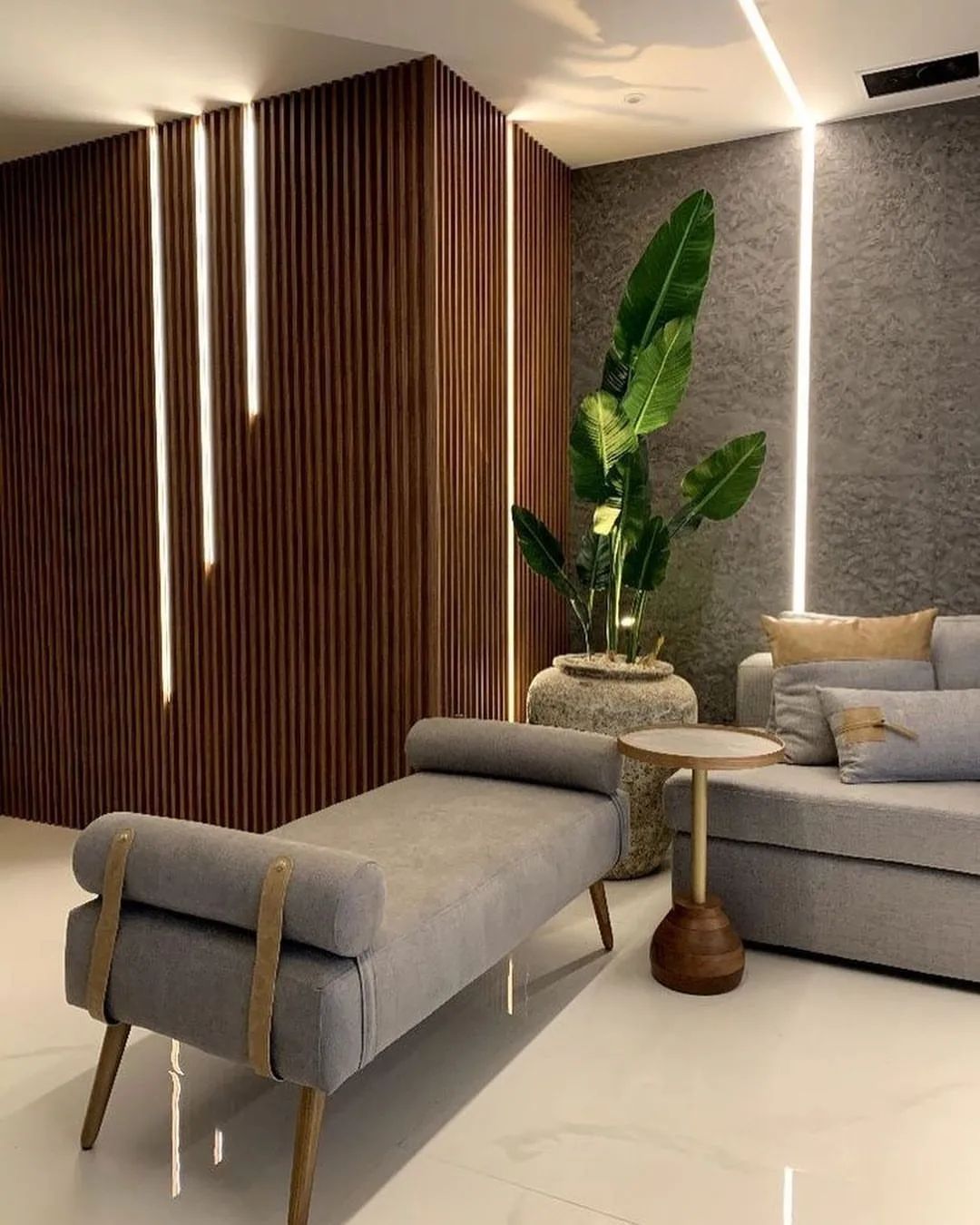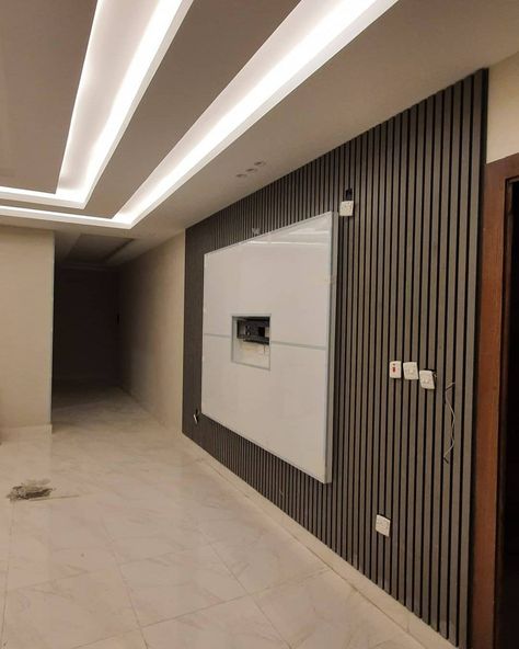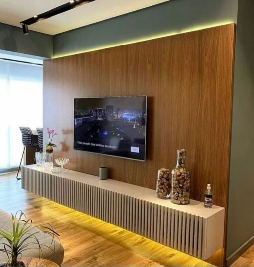 1. ​خلفيات التلفاز: دمج ألواح بديل الخشب الطولية مع بديل الرخام في المنتصف لخلق نقطة تركيز بصرية مذهلة.