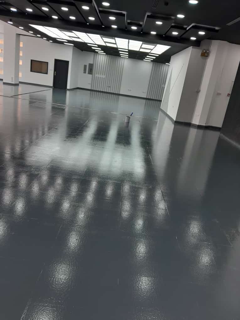 - تجهيز السطح: صنفرة الأرضية الخرسانية ميكانيكياً لفتح المسام وإزالة الزيوت.